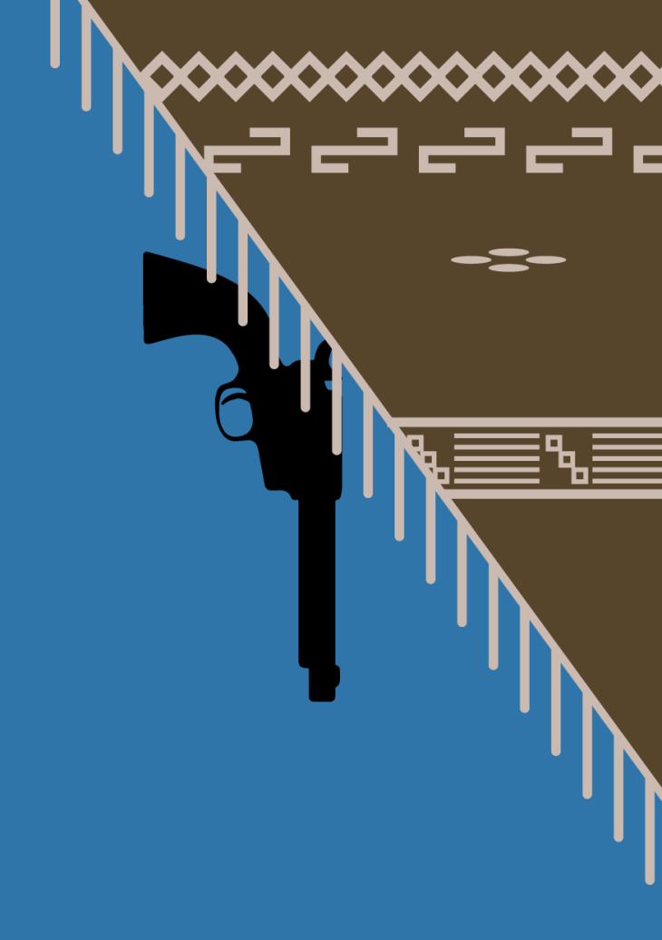 Les Revolvers : L'arme emblématique du genre Western. 5 sont penchés vers le bas car ces personnages meurent dans le film. 2 survivent.